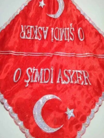 O Şimdi Asker Yazılı Pullu Kırmızı Kına Örtüsü